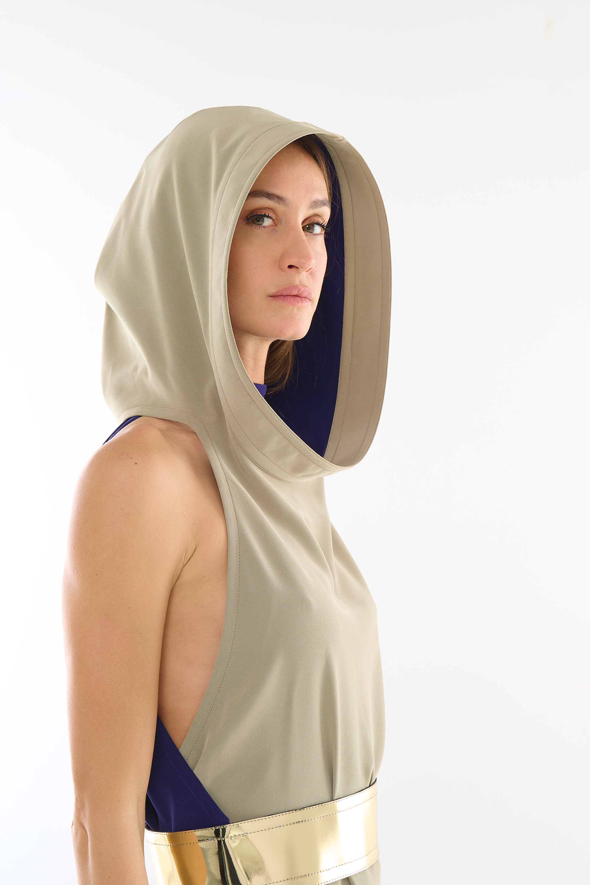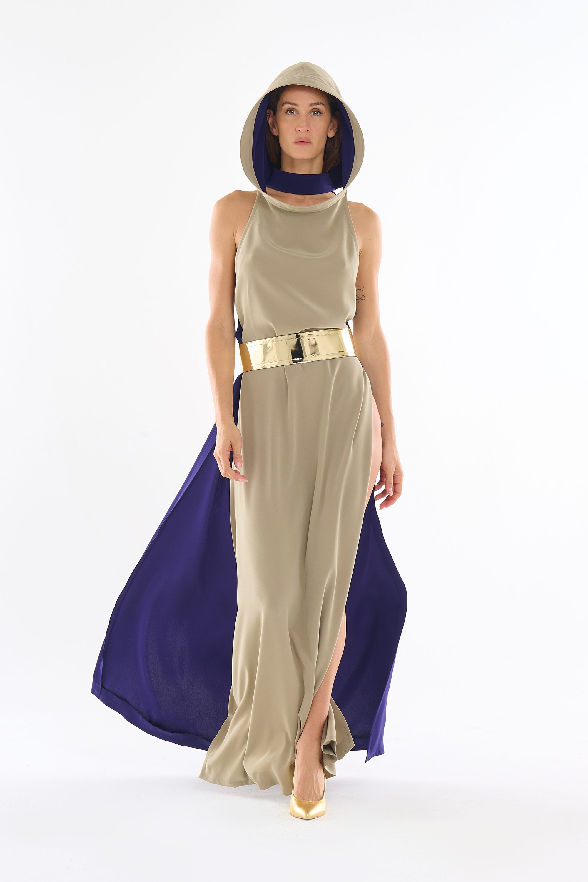 Vestido largo beige por delante y azul noche por detrás con capucha holgada y abertura alta en el lateral.
